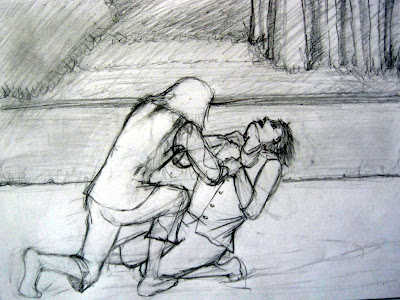 Sur le premier dessin, une petite réintervention de mon prof sur les visages et l’habillage du cousin mort. 🙂 tout de suite, ça le fait mieux. Enfin, sinon, ça se tenait pas mal au niveau des postures et des anatomies. ALLELUIA