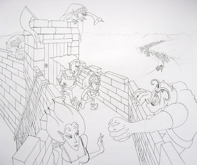 Faut dire que là quand même tu as choisi un angle de vue pas facile au niveau perspective, mais l’ensemble tient la route…Quelques petits trucs a revoir quand même : les barreaux de l’échelle (ceux du bas qui vont pas dans le même sens que les autres ! Et en plus c’est dangereux !) et puis le mur sur lequel grimpe l’orc, la perspective n’est pas bonne et il y a trop de rangées de briques (7 pour 5 sur le pan précédent !)