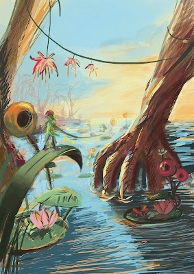 hé mais dis donc, c'est vachement sympa ça ! Le point de vu et le petit personnage fonctionne très bien je trouve. Je pense que je redresserai un peu l'arbre de droite, je trouve que ca fait trop de parallèle : tes deux arbres et la feuille du premier plan sont exactement dans le même alignement…