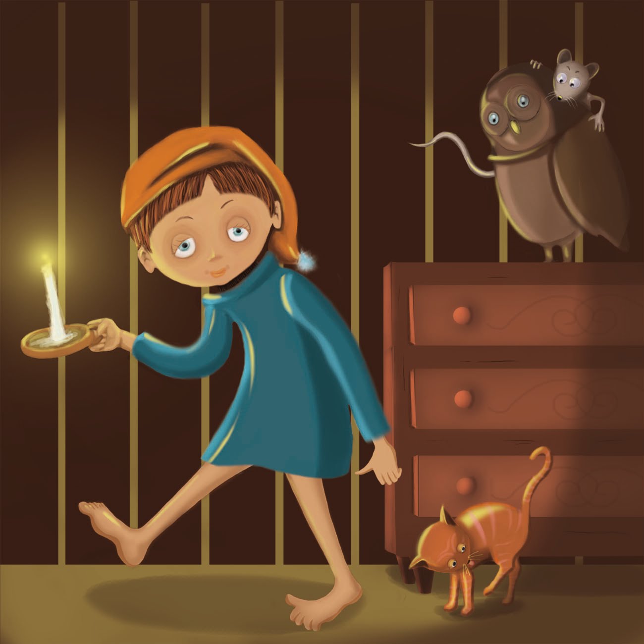 Moi dans cette scène j'aurais fait en sorte que l'éclairage ne vienne que de la bougie, et pas en plus d'une source externe. Genre, l'ombre au sol ne serait pas marquée car tout le sol serait plus sombre. Et le fond, la tapisserie, ne serait éclairé qu'à l'endroit de la bougie, en halo comme tu l'as fait mais un peu plus restreint. De manière à ce que les rayures claires de la tapisserie ne soient pas à la même intensité que la peau du garçon… ça rajouterait du contraste. Le volume marche très bien sur la commode, moins bien sur le chat je trouve…