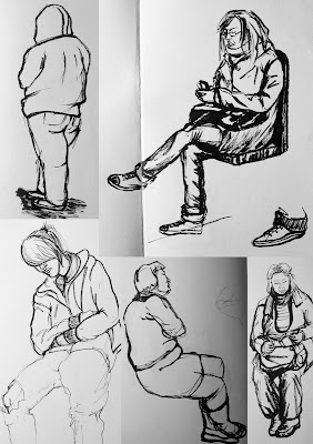 Bonjour Marie-Laure! J'aime beaucoup l'ado affalé(e). Comment fais-tu pour dessiner sans te faire remarquer? A la plage les gens s'en vont plus loin quand ils remarquent que je les dessine. C'est peut-être dû au contexte, ils n'aiment pas se voir dessiner en maillot? Bises, Annie