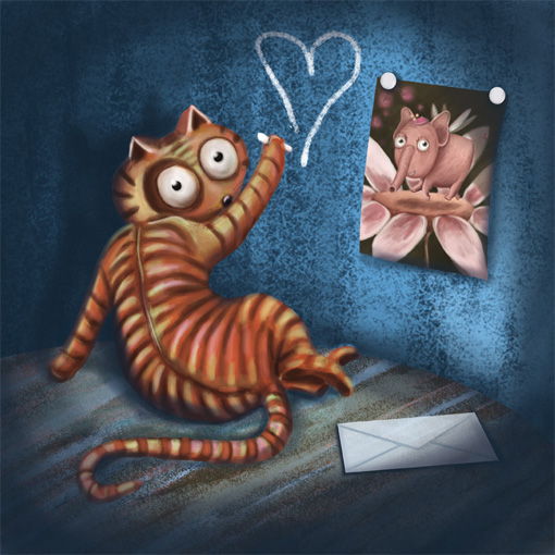 J’aime beaucoup ton chat !! la texture du mur, l’enveloppe par terre, le poster éléphant rose. C’est chouette chouette ! Et son air ahuri genre » merde, quelqu’un me regarde alors que je suis en train de dessiner un coeur sur le mur… la honte… » hihihi