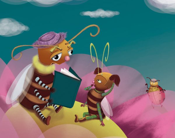 J’adooore la tronche de l’abeille qui lit l’histoire… mais on dirait qu’elle en a marre ! Elle est sympa ta technique de nuage. Belle trouvaille, ça fonctionne vachement bien. Voilà des nuages pas mous ^^ !!