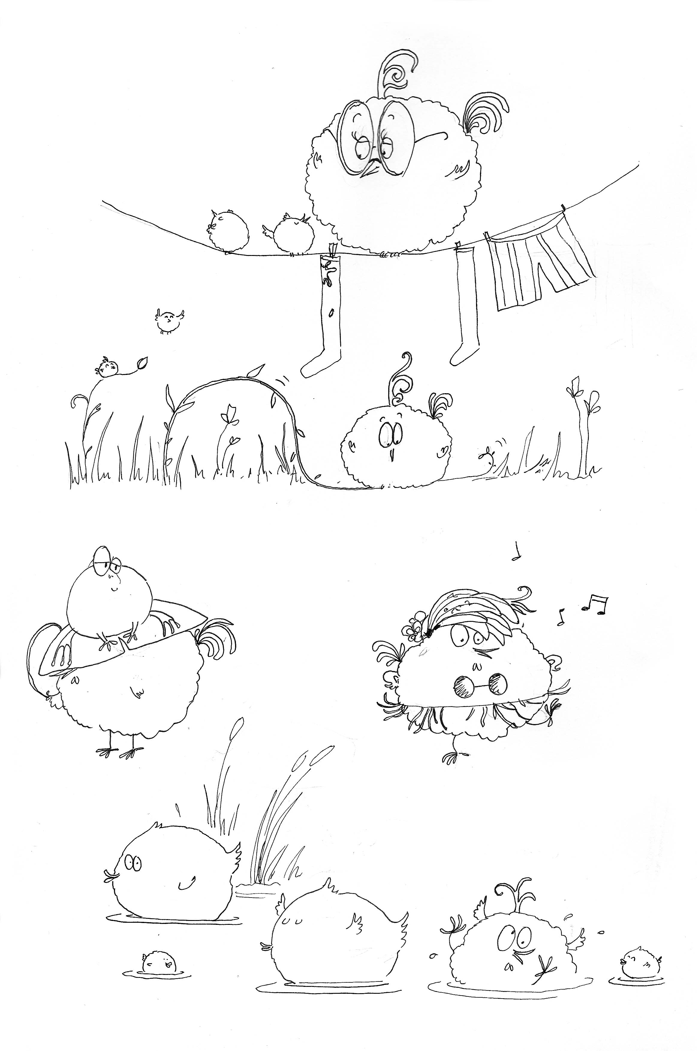 Et chacune représente une scène de l’histoire ! Joséphine se fait un parapluie régime de banane ou se déguise, je ne sais pas encore … :)) J’avoue que la poule qui panique dans l’eau m’a fait éclater de rire plusieurs fois ! Mais bon, je triche, je connais son histoire… ^^